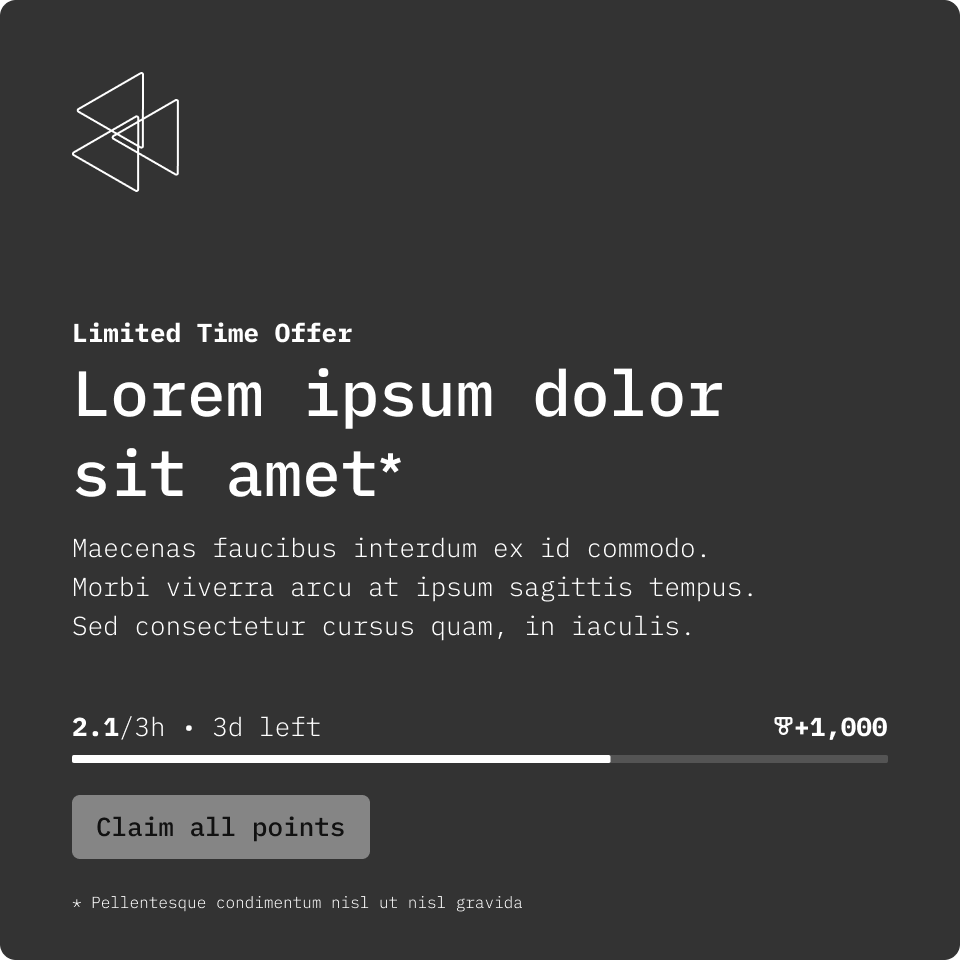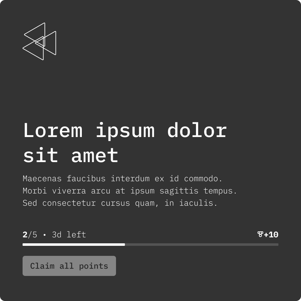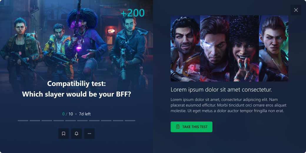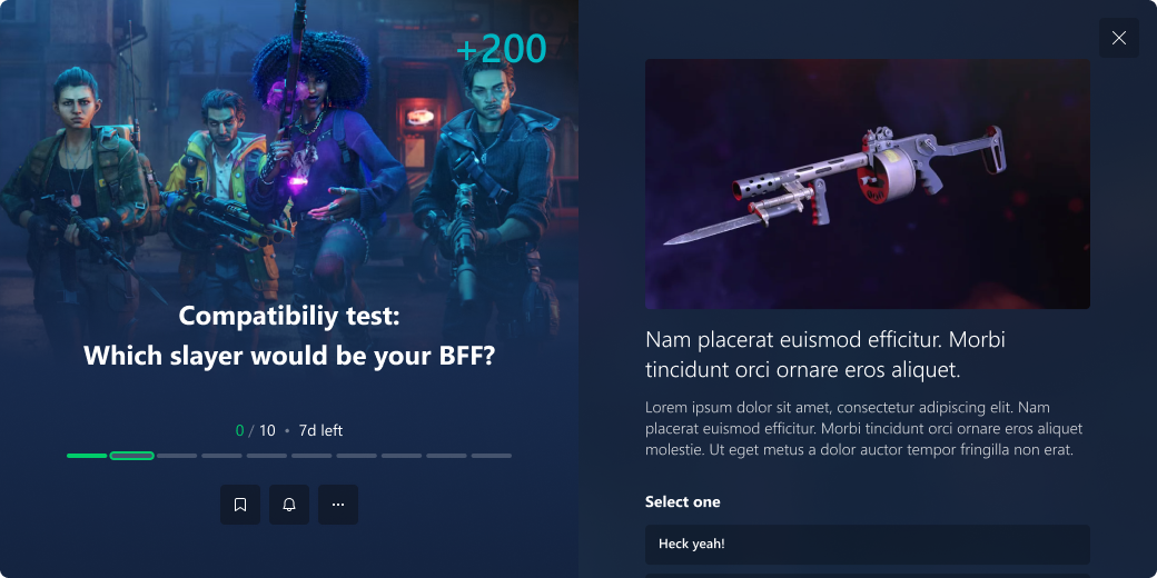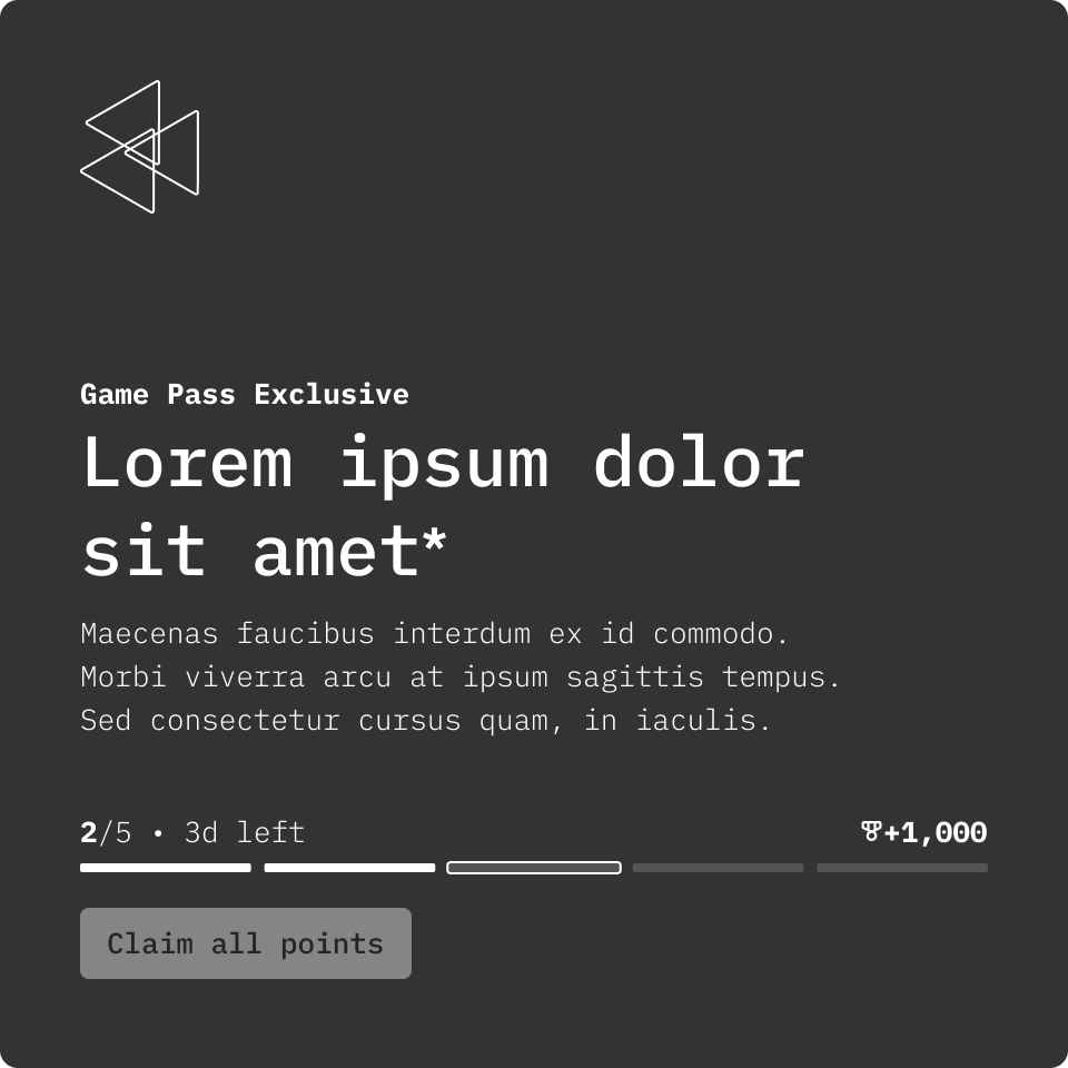 This gives the user a quick summary of their progress for a quest/redeemable and any key tasks that may require their attention. It was designed to be scalable in terms of allowing for supporting different types of tasks that require tracking progression.